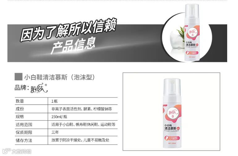小白鞋清洁慕斯采用中性配方,更护鞋,PH值为中性偏碱,使用不褪色,不变硬,不腐蚀~