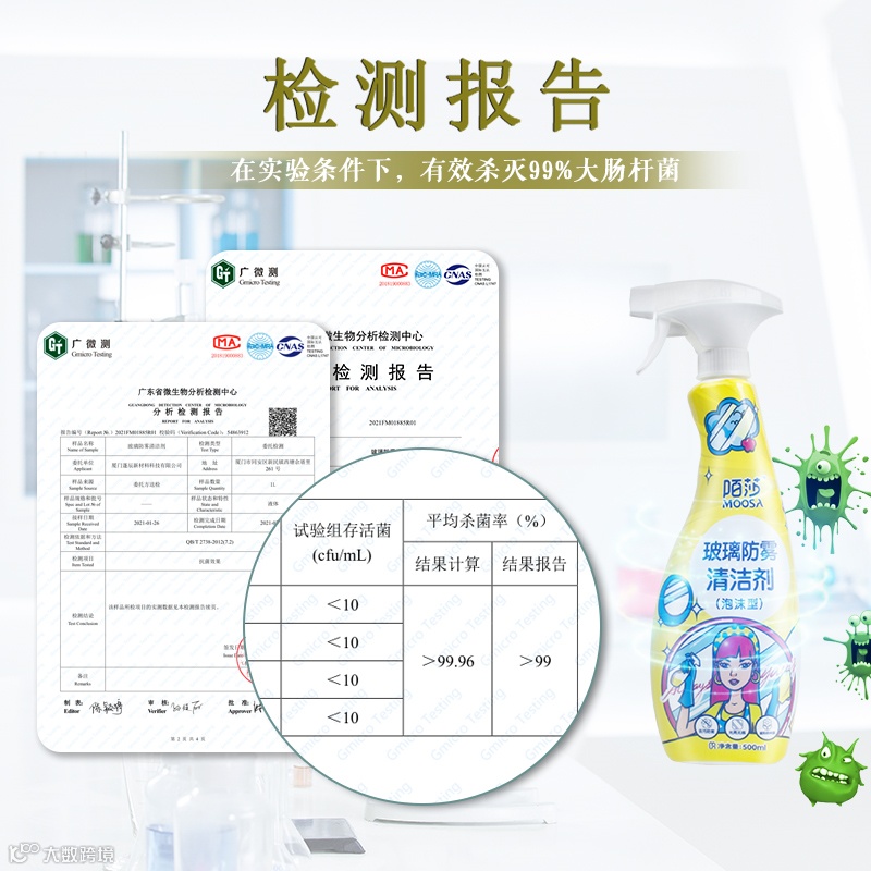 【防雾性】:独特防雾因子,可有效保持玻璃表面光亮清晰;