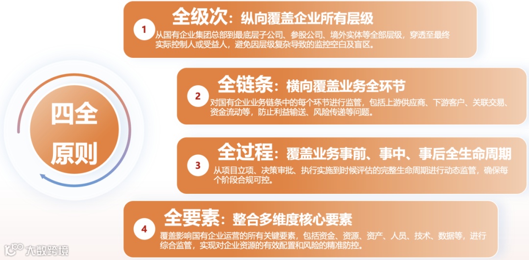 1)四全原则:根据《关于做好2025年中央企业内部控制体系建设与监督工作有关事项的通知》,穿透式监管要求覆盖“全级次(从集团总部到四级及以下单位)、全链条(资本-资产-资金-业务全流程)、全过程(事前-事中-事后全周期)、全要素(人、财、物、权全维度)”。