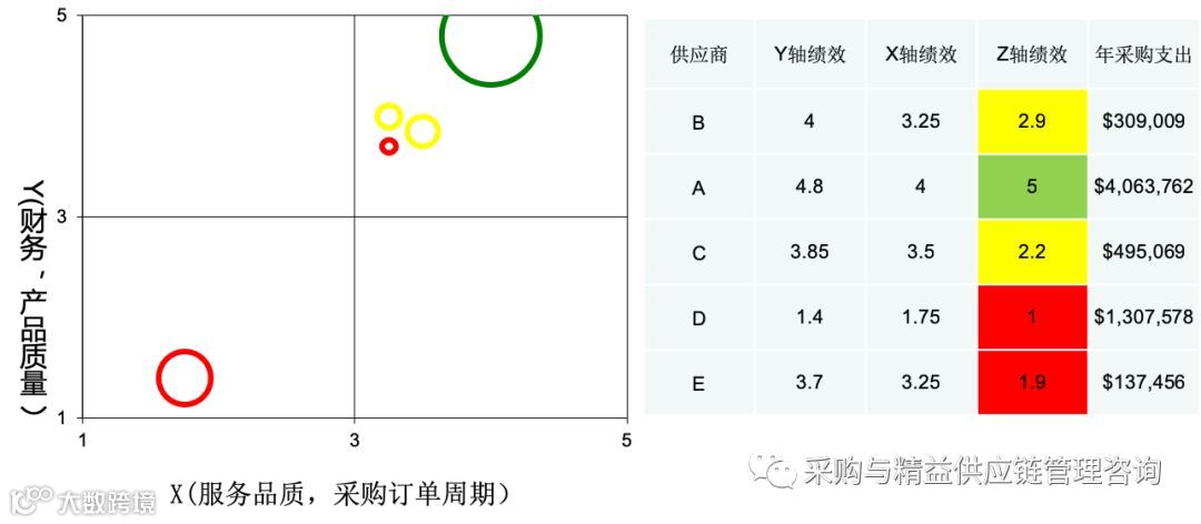 1、供应商B与C的准时交付率偏低,需要进行改善,故其Z轴绩效表现分别为2.9与2.2,模型自动标注为黄色;