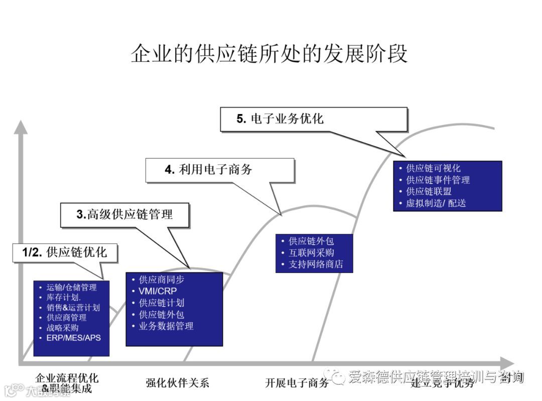 IBM对供应链管理的定义是:“借助信息技术和电子商务,将供应链上业务伙伴的业务流程相互集成,从而有效地管理从原材料采购、产品制造、分销,到交付给最终用户的全过程。在提高客户满意度的同时,降低成本、提高企业效率”。因此,“一个理想的供应链行为示例,即一个供应链中所有关联企业的业务流程集成统一的整体,以迅速、经济、流畅的方式向终端用户交付最终产品或服务”。正如罗马城不是一天建成的,企业的供应链也需要逐步发展与演变的过程,如下图: