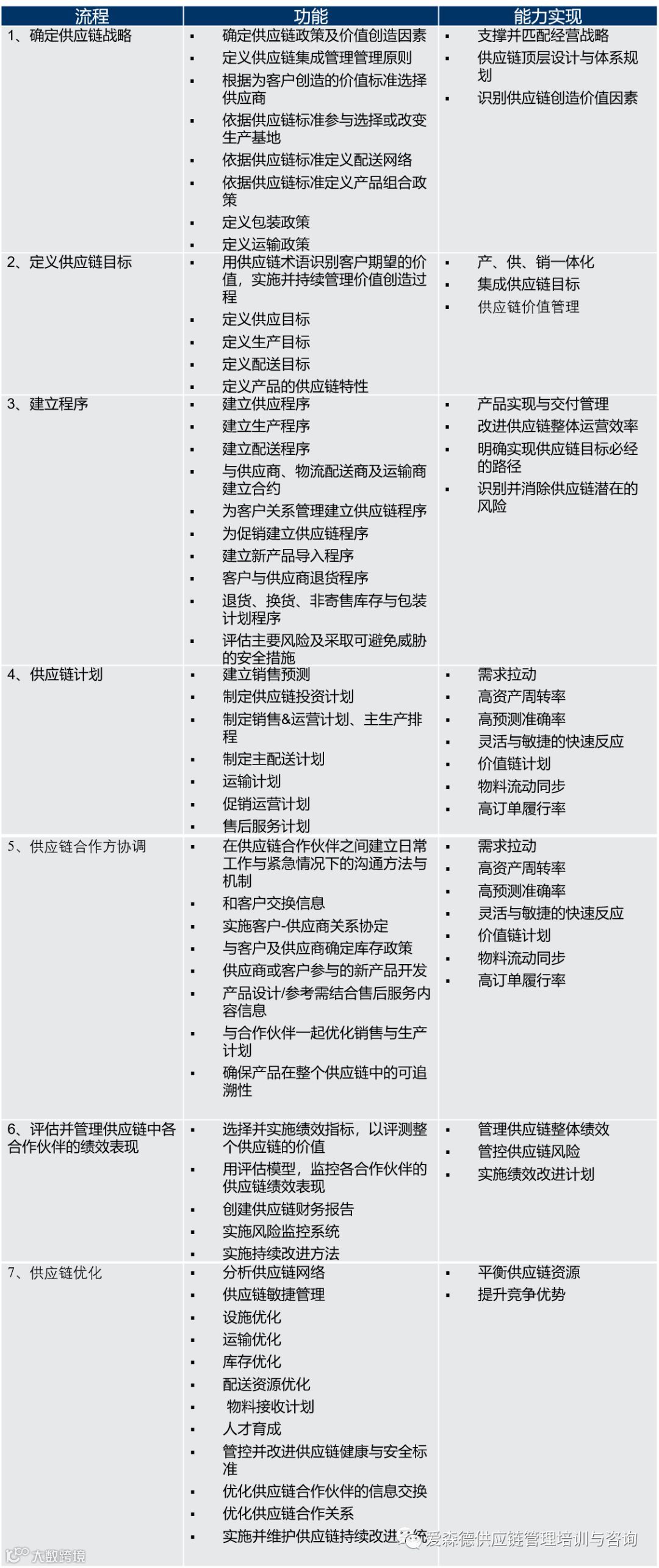 毫无疑问,流程1:“确定供应链战略”与流程2:“定义供应链目标”均属于企业的战略决策;流程3:“建立程序”属于运营决策;流程4、5、6、7属于战术决策。根据上述标准,我们可以为企业供应链流程的成熟度建立定量模型: