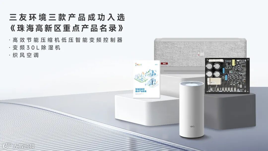 近日,珠海高新区科技创新和产业发展局正式发布《2025年珠海高新区重点产品目录》。经过严格遴选,三友环境技术有限公司旗下高效节能压缩机低压智能变频控制器、织风空调、变频30L除湿机三款核心产品凭借其卓越的创新性与技术优势,成功入选该目录!