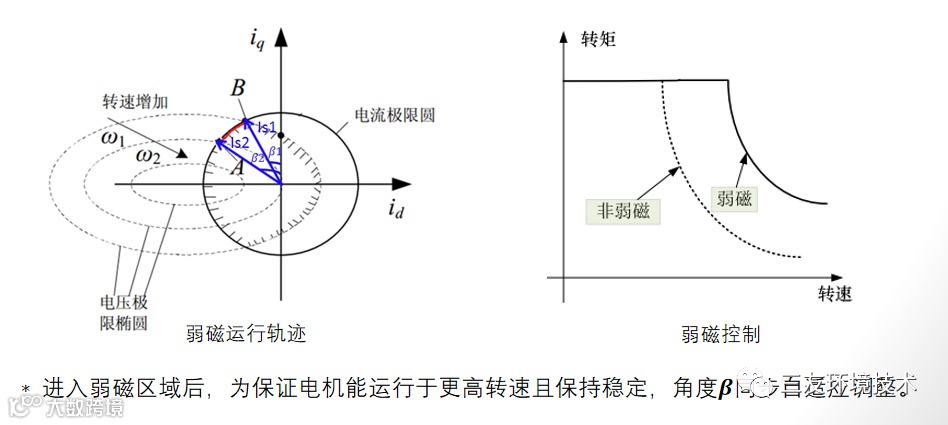 当转速由ω1增加到ω2,定子电流轨迹由B(Is1)到A(Is2),对应转矩角为β1和β2,β2 > β1,随着转速增加,进入弱磁区域,电机输出转矩变小