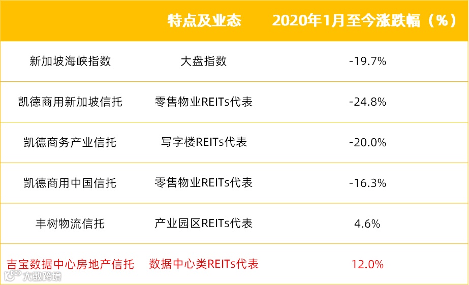 放眼海外,全球依旧笼罩在疫情带来的经济阴霾下,但仍有优质资产在黑暗中闪亮发光。以新加坡REITs市场为例,在大盘指数(新加坡海峡指数)今年跌去19.7%的前提下,一只叫吉宝数据中心的房地产信托(吉宝DC REITs)走出了不降反增的趋势,2020年至今已上涨12%。
