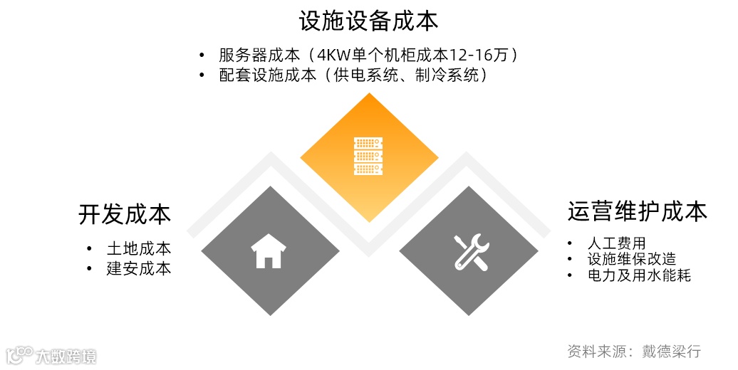 据戴德梁行数据显示,单个4KW机柜建设成本大约为12-16万元。在建筑面积2万平方米的数据中心一般可容纳2000-2500个机柜,单此设备投入就高达4亿元,这还不算上3-5年内服务器的更新换代投入。