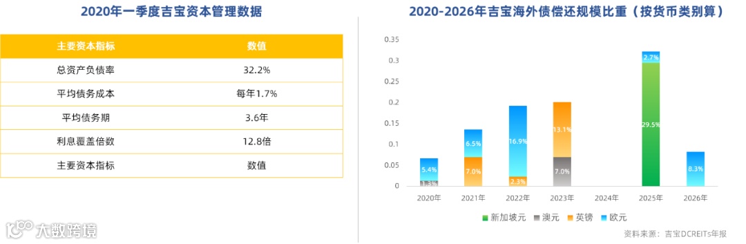和其他成熟市场REITs类似,吉宝的扩张模式以收购物业为主,这需要较低的融资成本来支撑。通过年报数据可知,吉宝DC REIT在2020年一季度平均融资成本在1.7%,利息覆盖倍数在13倍左右,财务杠杆率在32.2%,债务期限3.6年,现金流足够支撑日常经营与收并购活动。