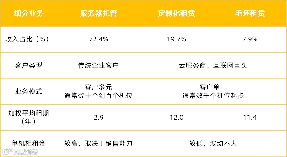 服务器托管属于多元化客户的零售模式,以传统企业客户为主,客单价高,也非常考验销售能力,但租期通常在3年之内,属于弹性较大但容易提升的业绩爆发点。