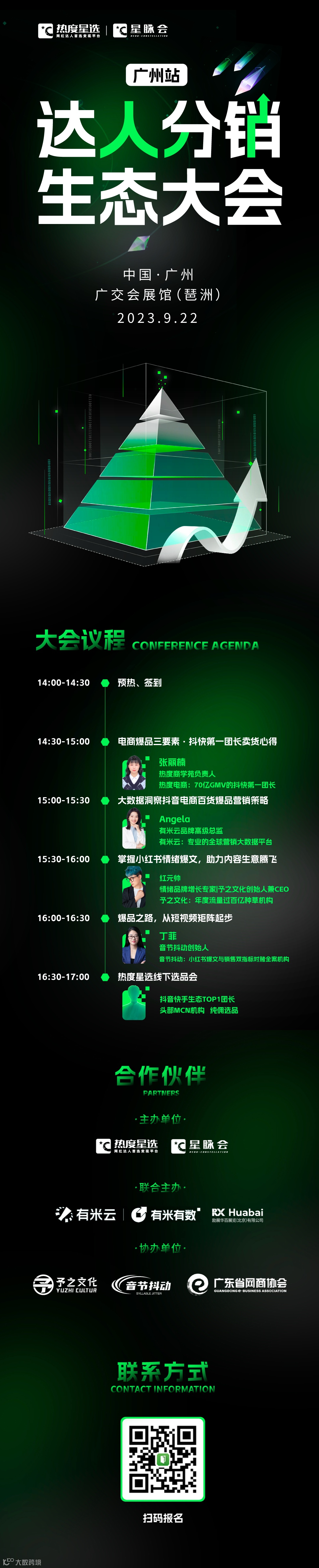 左手现场一手优质资源链接,右手行业头部玩家操盘经验取经,9月22日,想要赢在2023淘金下半场起跑线,热度达人分销生态大会广州站现场与你相约。