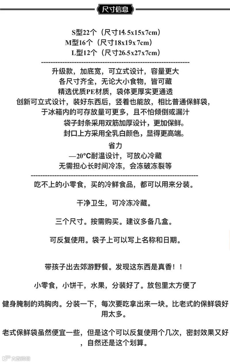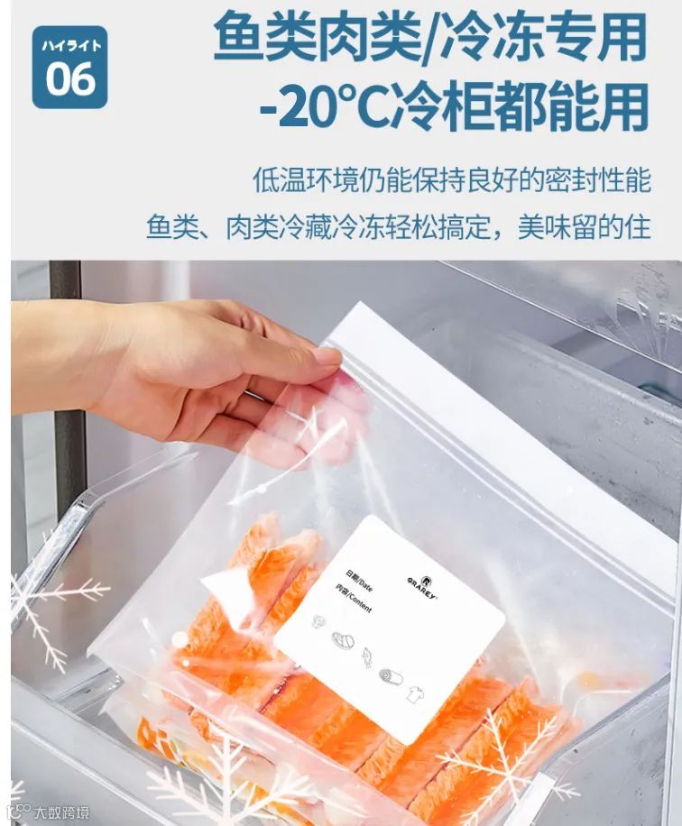这款密封袋,我最喜欢的是那能“底部加宽站立式”的设计,关键时候真的不错。装好食物,放入冰箱,一个袋子一个袋子站起来,冰箱整洁不少,吃进嘴的食物也更放心,更新鲜,简直是冰箱食物保鲜必备👍