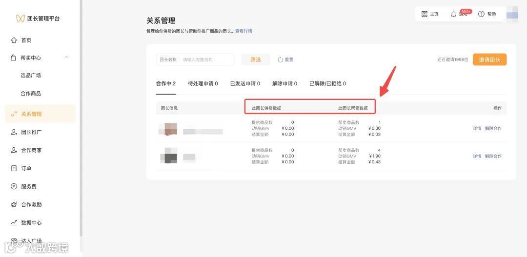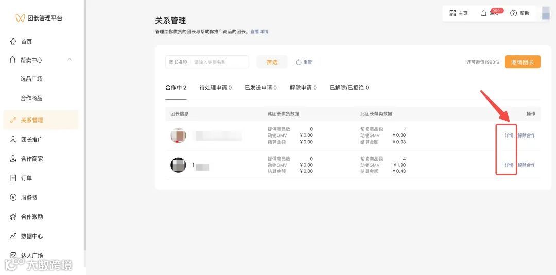 「关系管理」模块中,供货团长和帮卖团长均可主动发起解除合作申请。