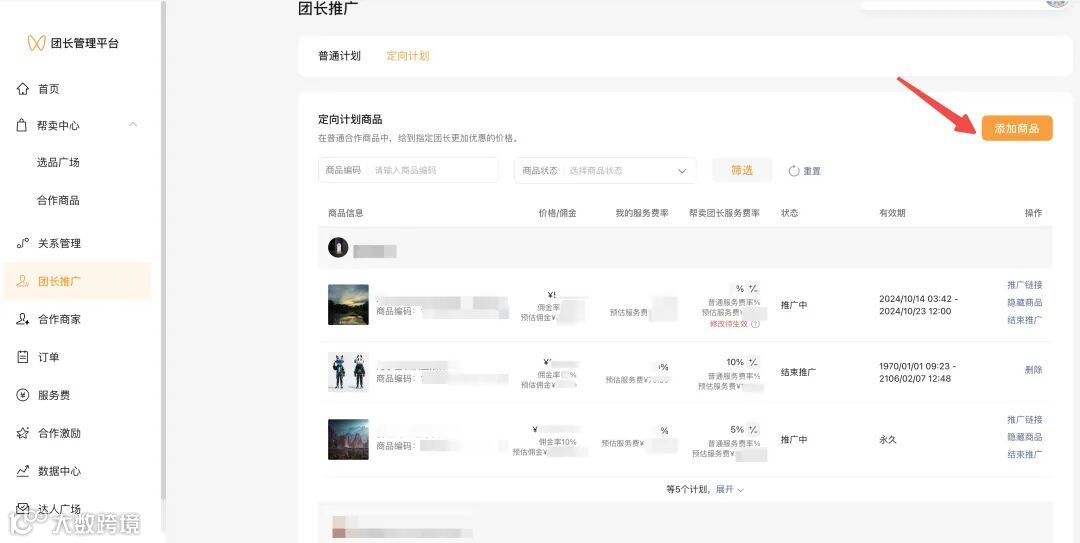 定向商品计划:「团长推广」-「定向计划」-「添加商品」,填写帮卖团长服务费率。添加商品成功后,在「设置定向人群」模块中,选择推广时间和定向合作的团长。