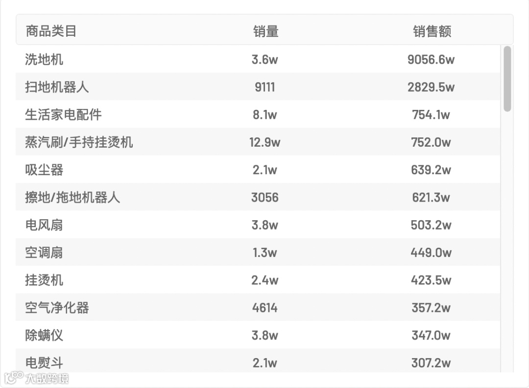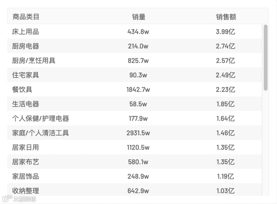 家居用品类目GMV环比上周数据增长了21.6%,子类目GMV货品结构为床上用品(14.13%)、厨房电器((9.71%)、厨房/烹饪用具9.09%)、住宅家具(8.82%)、餐饮具(7.9%)、生活电器(6.56%)和家庭/个人清洁工具(5.15%)等。床上用品预估累计GMV增长了6700w,类目GMV涨幅为20.2%;厨房/烹饪用具类目累计GMV为2.57亿,相比上周GMV略有上升。厨房电器类目GMV环比增量为4100w,增长了17.6%;餐饮具类目累计GMV为2.23亿,环比上周增长了5300w,类目涨幅为31.2%。生活电器类目本周GMV环比增长了4000w,涨幅为27.6%。洗地机产品有较大增量;清洁工具类目GMV比上周多产出约400w,涨幅为2.8%。