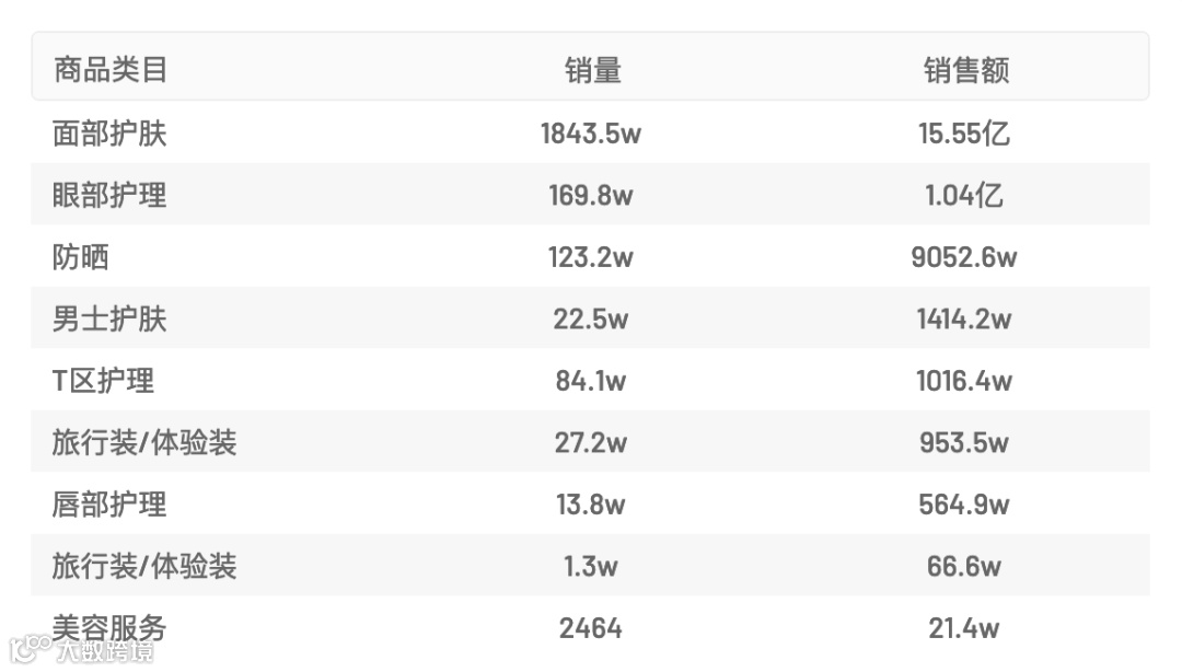 护肤类目中,面部护肤的环比GMV增量为100w,类目产出体量与上周基本持平;防晒类目GMV环比增量为2480.9,类目涨幅为37.8%,环比GMV存在明显增长;眼部护理类目累计GMV为1.1亿,环比增长了2400w,类目涨幅为27.9%。彩妆类目中,面部彩妆GMV比上周下滑了600w,类目降幅为为5.5%;唇部彩妆GMV对比上周下滑了1324.5w, GMV环比减少了13.7%;美妆仪器类目本周累计GMV环比增量为2800w,类目GMV增长率为21.5%,面部美容仪器类目贡献了绝大多数的增量部分。
