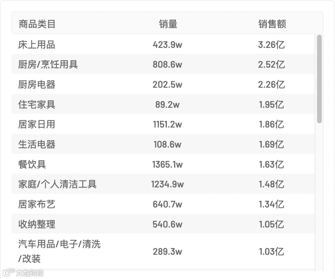 家居用品类目GMV环比上周数据未有较大起伏,小涨了1.2%,子类目GMV货品结构为床上用品(13.23%)、厨房/烹饪用具(10.25%)、厨房电器(9.19%)、住宅家具(7.93%)、居家日用(7.57%)和生活电器(6.58%)等。床上用户预估累计GMV下降了2600w,降幅为7.4%,餐饮具类目预估累计GMV下降了1100w,占比为6.3%。除了这两个类目外,其他主要类目环比均有增长,厨房/烹饪用具类目增量最大,类目GMV增长率为16.7%;其次,家庭/个人清洁工具类目增量较为明显,环比增长率为20.3%。厨房电器和住宅家具等类目本周累计GMV稍有增量,类目增长率分别为9.2%和7.1%。