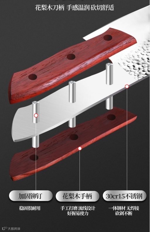 2、 花梨木手柄,有重坠感,握感舒适,轻松省力,结实耐用;