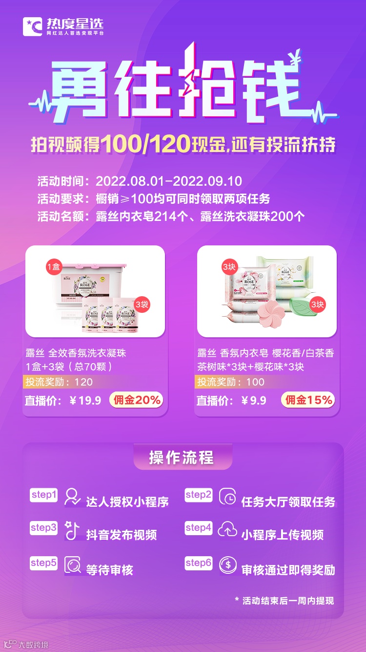 上期“热度星选”联合“露丝”品牌的短视频种草任务,近400位达人朋友参与了任务并成功领取现金福利。活动回顾: 拍一条视频得100元!这波“羊毛”薅的太狠了...