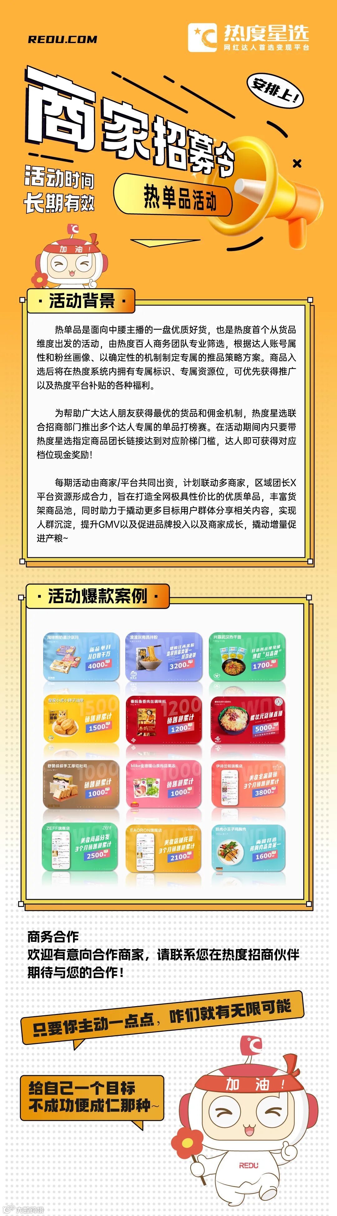 热单品是面向中腰主播的一盘优质好货,也是热度首个从货品维度出发的活动,由热度百人商务团队专业筛选,根据达人账号属性和粉丝画像、以确定性的机制制定专属的推品策略方案。商品入选后将在热度系统内拥有专属标识、专属资源位,可优先获得推广以及热度平台补贴的各种福利。