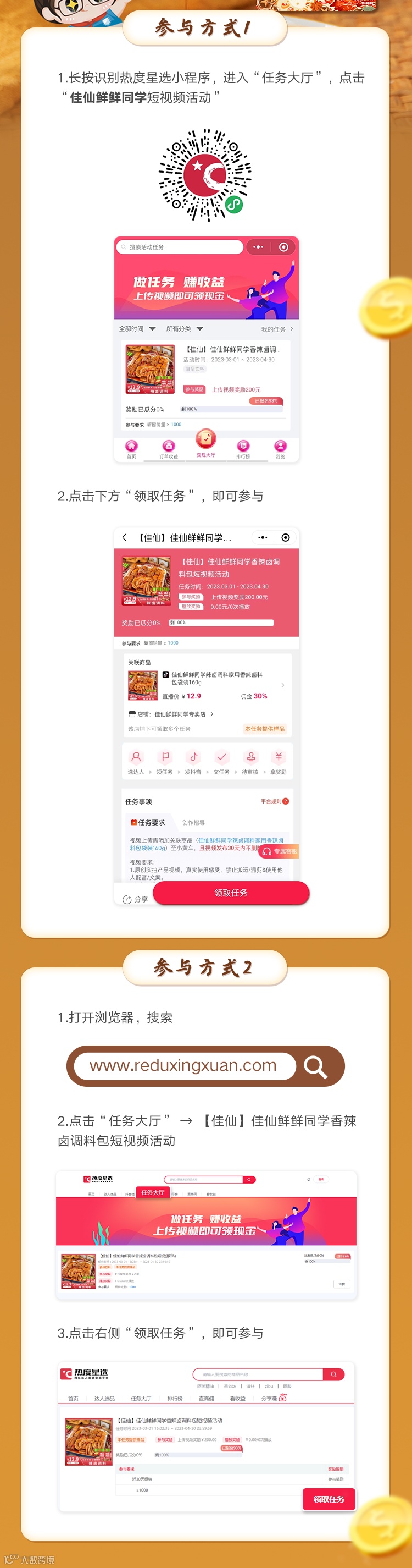 品牌(佳仙)任务参与,上传符合活动要求的视频(需挂商品链接),即可获得