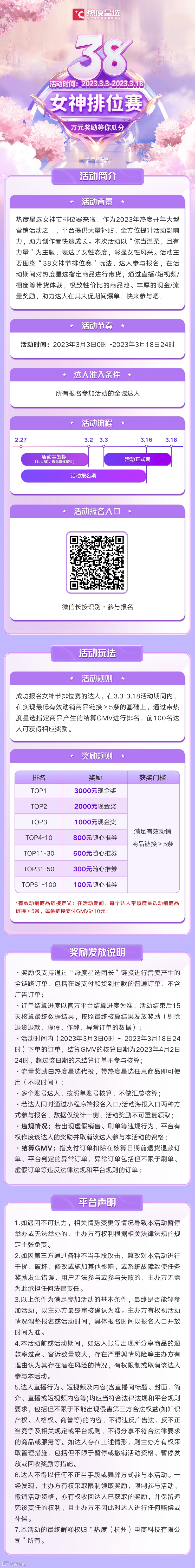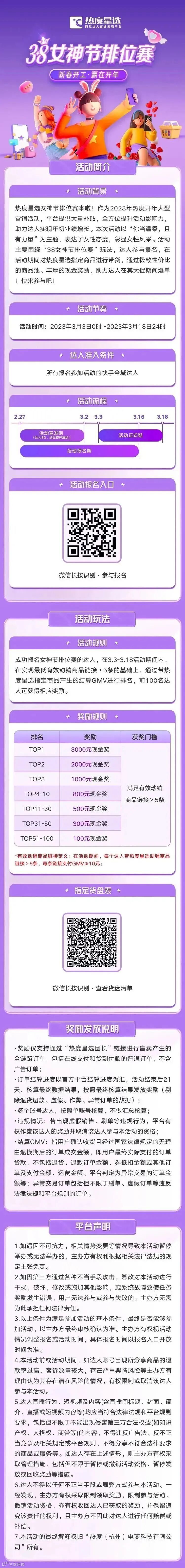 3月,一元复始,万象更新,消费市场复苏。当汹涌澎湃的「她力量」强劲驱动「她经济」,三八节已经成为「营销日历」中绕不过去的一大节点。热度达人们,如何抓住3·8节日流量,打开生意增长?为此,热度星选将重磅上线抖音&快手双平台3·8女神节排位赛活动,助力达人们在重要节点弯道超车!