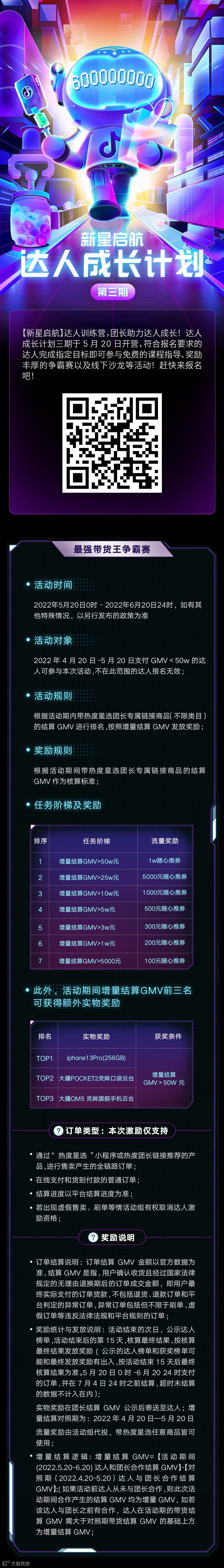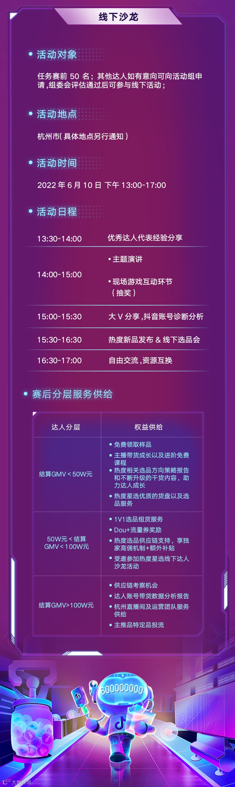 除此之外,活动期间,我们将会举办线下沙拉交流会,邀请行业大V分享,行业头部达人线下经验交流,同时还有全方位的赛后分层服务供给,全面助力达人带货GMV的增长!