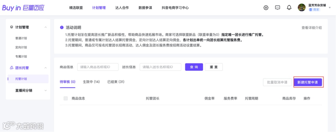 ①商品需要先设置普通计划,加入到联盟里;在商家后台-【精选联盟】-【计划管理】-【托管计划】,点击【新建托管申请】