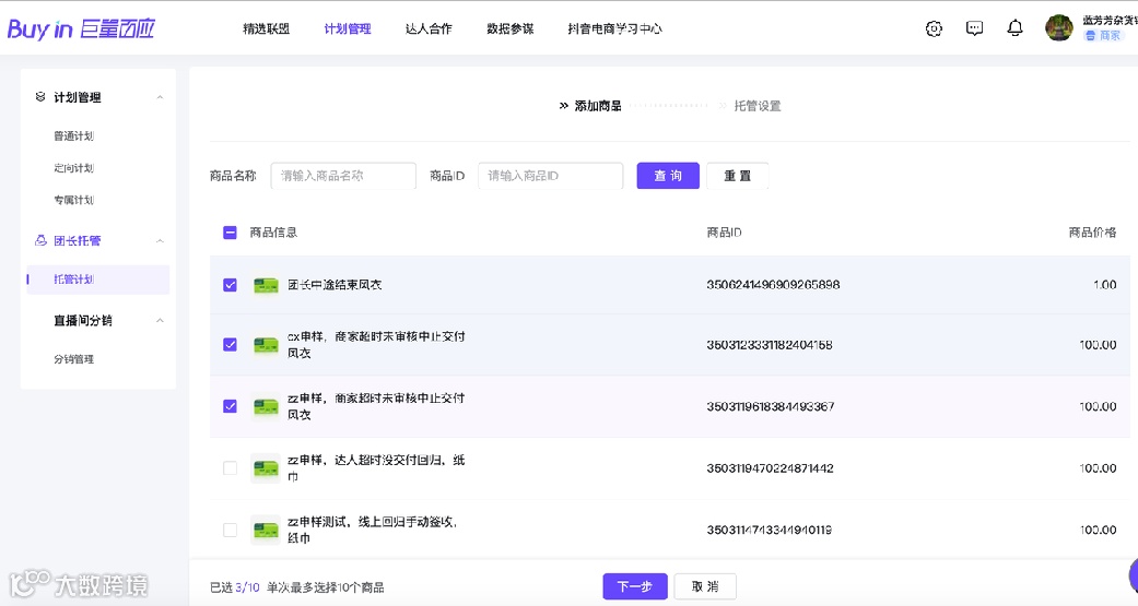 ②勾选要托管的商品,点击【下一步】