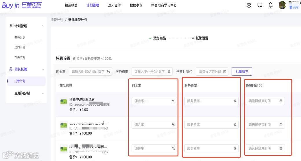 ③填写给达人的佣金率、给团长的服务费率、从此刻到什么时间结束(以上三点需提前与团长沟通)