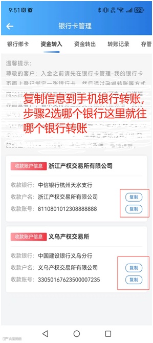 报名成功后回到首页→点击右下角“我的”→我的订单查看应付金额→返回→银行卡管理→资金转入→复制义乌产权交易所收款银行信息,打开注册账号时绑定过银行卡的手机银行(中国建行)进行转账→我的账户确认到账→返回我的订单→确认付款。