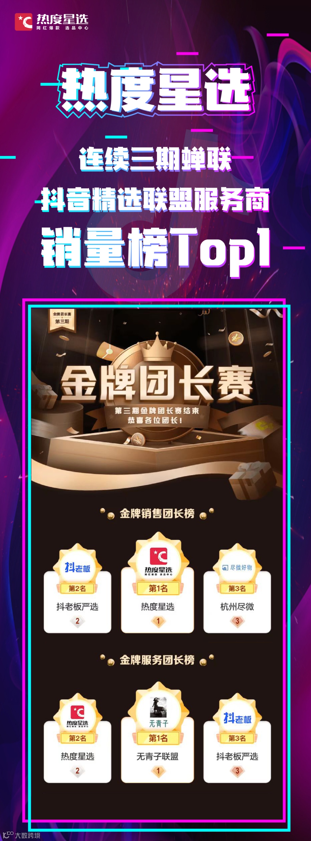 前两届的抖音金牌团长赛,如火如荼的场景还历历在目,近期,热度星选又一次蝉联金牌团长赛销售榜Top1!