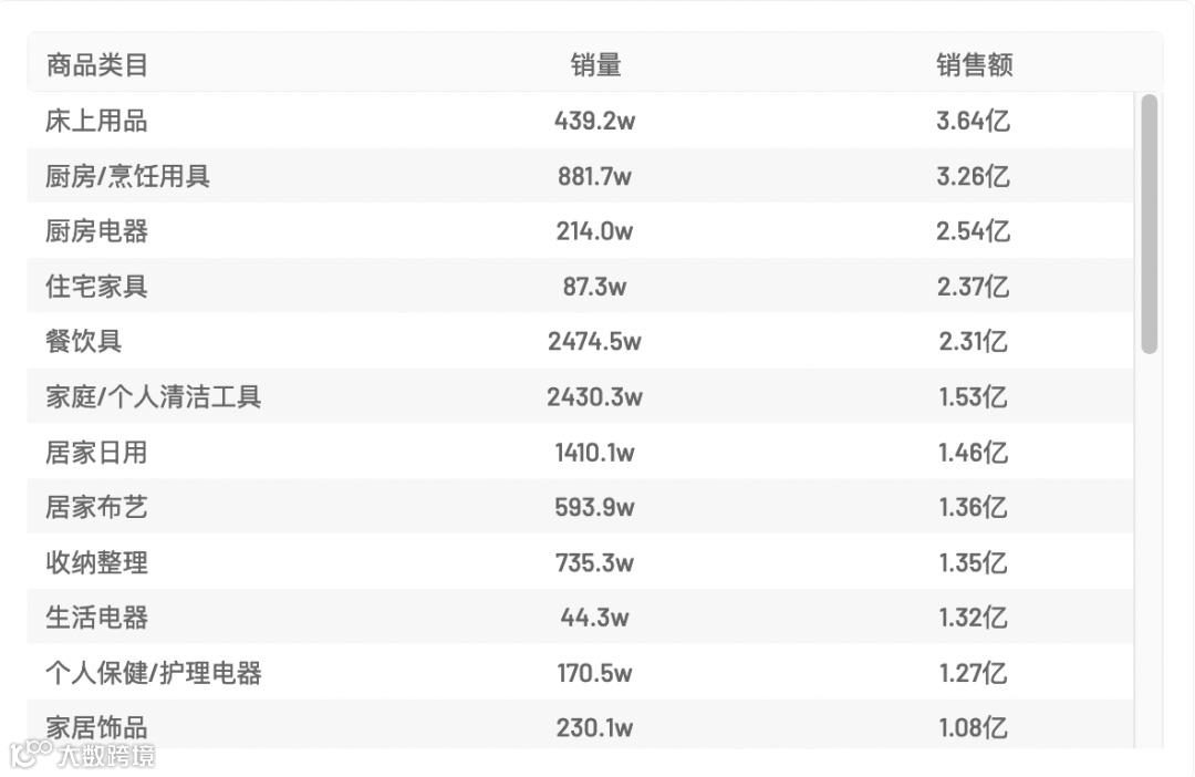 家居用品类目GMV环比上周数据增长了6.0%,子类目GMV货品结构为床上用品(14.71%)、厨房/烹饪用具(11.94%)、厨房电器((9.09%)、餐饮具(8.47%)、住宅家具(8.31%)、家庭/个人清洁工具(5.28%)和居家日用(5.18%)等。本周增量较大的子类目为床上用品,类目GMV增量为2700w,环比增长了6.9%,主要的增量来自被子、床笠和毯子等产品,枕头、床品套件和凉席等产品有明显下滑。厨房/烹饪用具类目GMV环比增量为3300w,类目增长率为10.7%,其中烹饪用具类目近30日增长率为17.34%,刀具产品累计GMV增长了165.4%,锅具/煲/烧水壶产品增长了7.8%。餐饮具类目本周累计GMV相比上周有小幅度增长,杯子/水杯/水壶产品产品比上周多产出3600w,环比增长率为38.2%,其他产品略有增量。家庭/个人清洁工具类目环比下滑了9%,主要是家务/地板清洁用具类目产生的波动,车载清洁用具虽涨幅较大,但限于其类目的体量,曝光和声浪并不大。