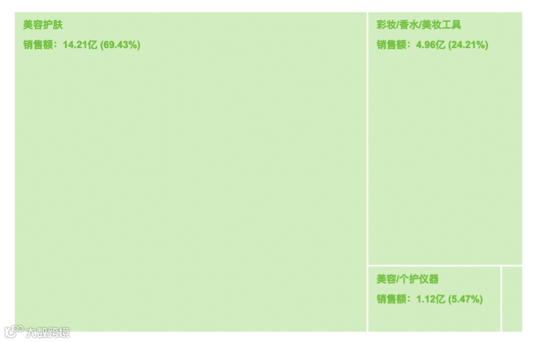 美妆类目预估GMV环比上周下滑了14.0%,该类目的子品类销售额占比分布为美容护肤(69.43%)、彩妆/香水/美妆工具(24.21%)、美容/个护仪器(5.47%)。美妆品类销售额中,面部护肤、眼部护理、防晒、面部彩妆、唇部彩妆、美妆工具等六大细分类目贡献了大部分销售额,占比为84.4%(美容护肤66.9%,彩妆17.5%)。
