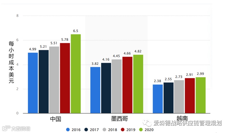 将生产从中国转移到东南亚国家也需要不同的物流战略。与中国不同的是,这些地区往往没有能够处理大型集装箱船或直达主要市场的海运班轮的高效、大容量港口。这意味着将有更多货物通过新加坡、香港或其他枢纽转运,运输到市场的时间也将延长。因此,从长远来看,将中国完全排除在全球供应网络之外将是一个错误。中国深厚的供应商网络、智慧、灵活而能干的劳动力、大型而高效的港口和运输基础设施,意味着中国在未来几年仍将是一个极具竞争力的供应货源基地。由于中国是世界第二大经济体,企业保持在中国市场销售和获取竞争情报非常重要。但是,中国及外资企业需要面对的是2016年至2020年,比较中国、越南、墨西哥的每小时制造业劳动力成本,中国已经排名第一,其中,中国在2010-2020年间,每月最低平均工资的涨幅已经超越印度、墨西哥、越南等东南亚国家: