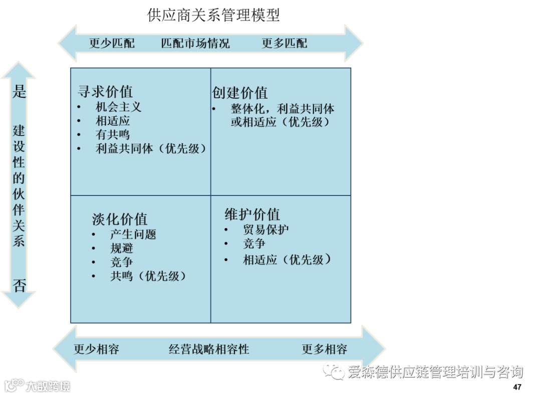 每种关系类型均分别对应供应商关系管理模型的四个象限,在右上角象限中,建立相互适应的利益共同体则是供需双方最理想的合作关系,在此象限中的供需双方应努力创建双赢的合作价值。如果读者想了解每种供应商关系类型所对应的业务模式,请加此公众号并留言。由于篇幅的关系,在这里就不做详细的阐述。