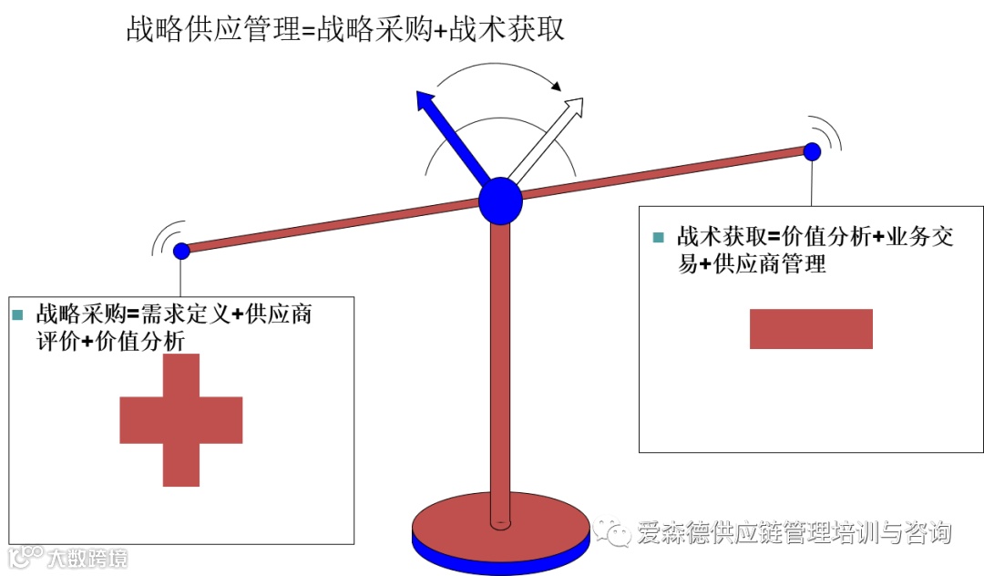 战略供应管理包含战略采购与战术获取两个层面,两者相辅相成,缺一不可。战略采购负责对内部客户的需求进行充分的理解与定义,并采用正确的方法对供应商的能力进行全方位的评价,如品质保证、成本控制、产品交付及售后服务能力的强弱,也即考量供应商带来的总价值;而战术获取在战略采购正确的寻源及供应商评价基础上,负责获取正确的货物和服务的过程。战略采购与战术获取都包含对供应商的价值分析,战略采购聚焦资源获取的事前控制,而战术获取重点在于事中及事后控制。