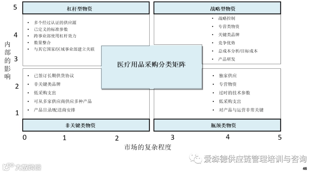 对于属于服务领域的医疗行业或其它制造工业,正确实施战略供应管理的第一步是要对所需要的货物进行分类,对于医疗用品而言,其分类标准如下: