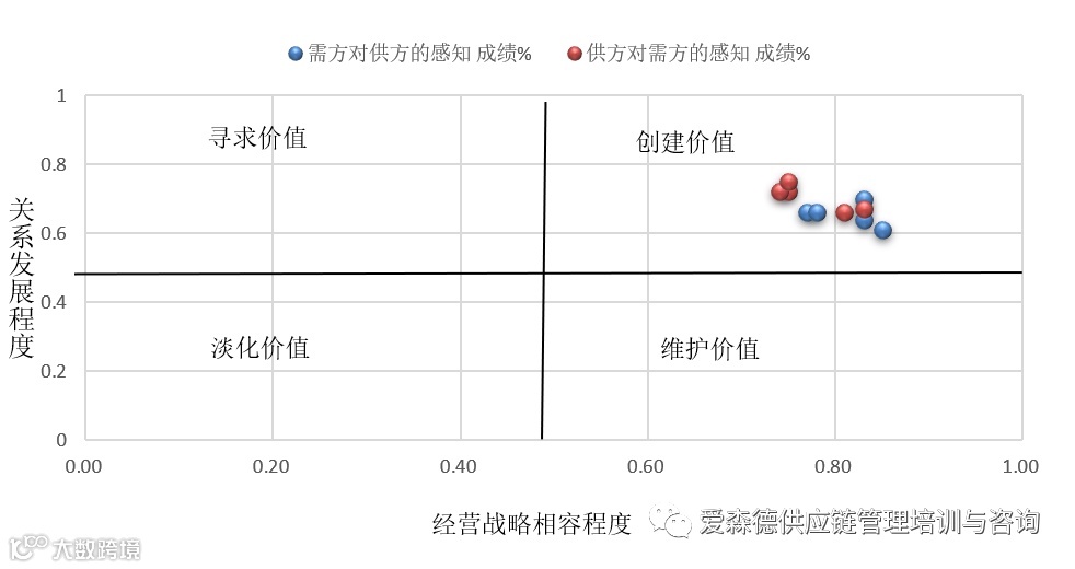 我们把三个维度,供应商关系、经营战略相容及合作关系程度放在一起利用上图给出的数据建模型分析,则可得出供需双方彼此感知及战略合作关系的匹配程度: