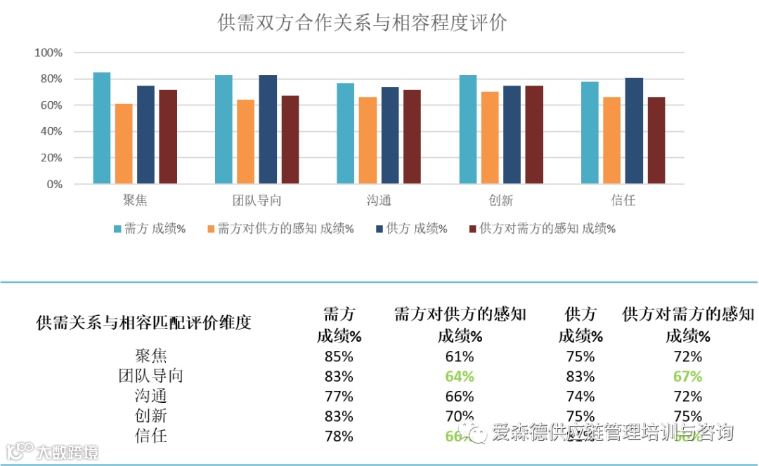 很明显,上图中的供需双方从5个维度,市场聚焦、团队导向、沟通、创新及信任进行评价,均处于右上角第一象限,因此供需双方的经营战略匹配程度及合作关系很好,应该为彼此创建双赢的合作价值。