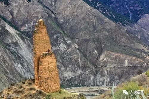 扎西达瓦背着孩子在村子里的藏族碉楼遗迹上。波罗村坐落在地势相对平坦的山包上,上面有不少耕地,碉楼是古时藏族居民为防止外来入侵者所建的防御建筑。