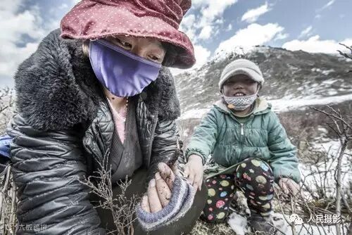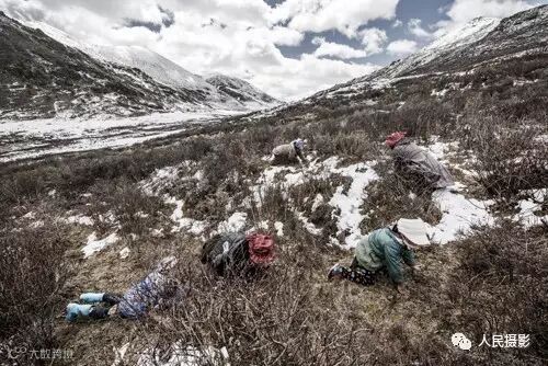 大雪逐渐融化,留守营地的妇女会带着孩子在附近的山坡上寻找冬虫夏草,身体强壮的年轻人会选择去更远更高的山上寻找。