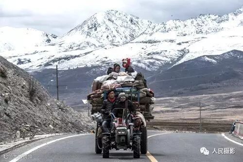 采虫草的人们开着拖拉机行驶在理塘县318国道上,奔往大山里的采虫草营地,背后是横断山脉上的大雪山。理塘县位于四川省西部,甘孜藏族自治州西南部,在金沙江与雅砻江之间,横断山脉中段,县城海拔4014米。