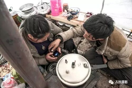 2014年,在采冬虫夏草营地的帐篷里休息时,扎西正在教妻子如何使用手机,这部旧的iphone4是一位朋友送的。
