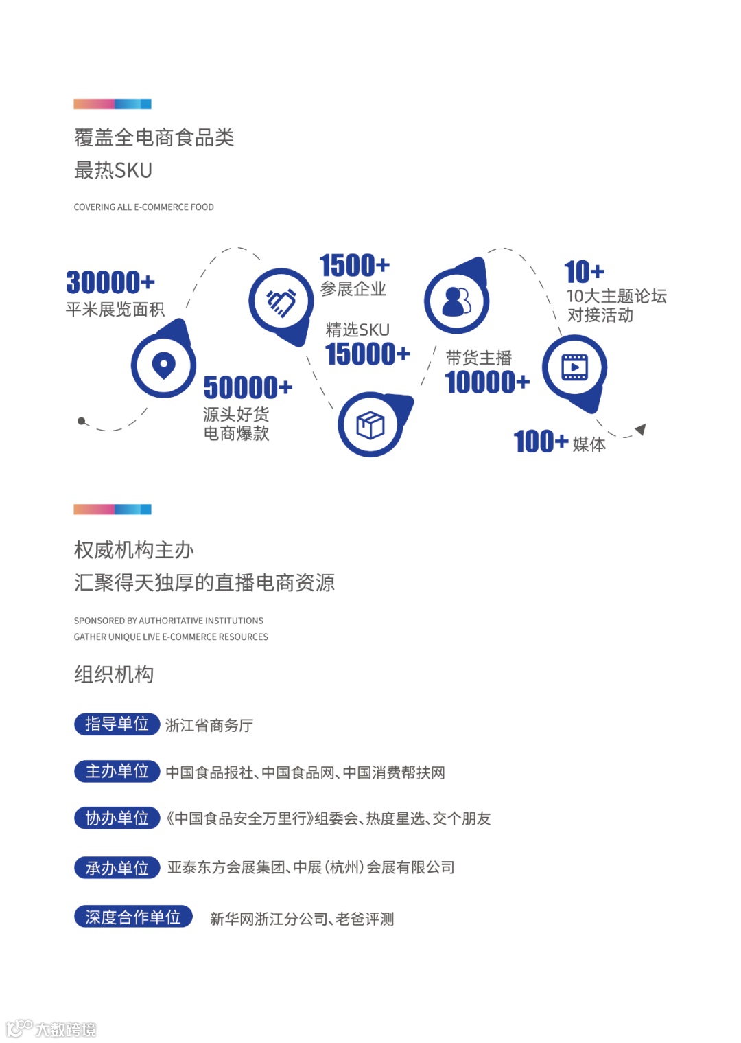 本次博览会以「与“食”俱进·共链共生」为主题,现场超30000㎡面积,汇聚来自国内外上千家优质供应链企业,1000+MCN机构、500+直播电商网红、50000+直播电商专业观众汇聚杭州,邀请抖音、快手、小红书、京东、淘宝、拼多多等头部电商平台,现场与优质品牌对接,连接直播电商上下游,驱动传统行业转型,实现数字化经济新增长。