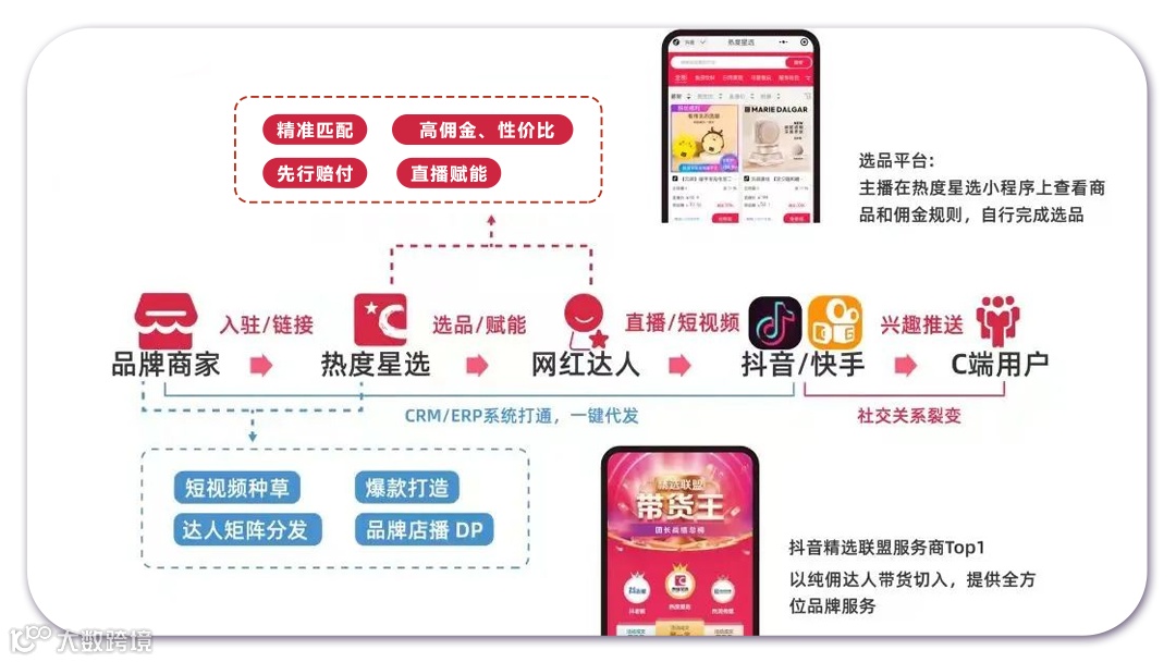 热度星选成立于2020年10月,是专注服务直播电商的达人选品&品牌营销的头部生态服务商,通过SaaS系统连接达人、品牌方和抖音/快手等内容电商平台。自项目上线以来,累计合作商家80000+家,精选SKU100000+个,合作带货主播150000+人,多次蝉联抖音精选联盟服务商TOP1,抖音短视频带货机构TOP1,快手快分销团长服务榜TOP1。