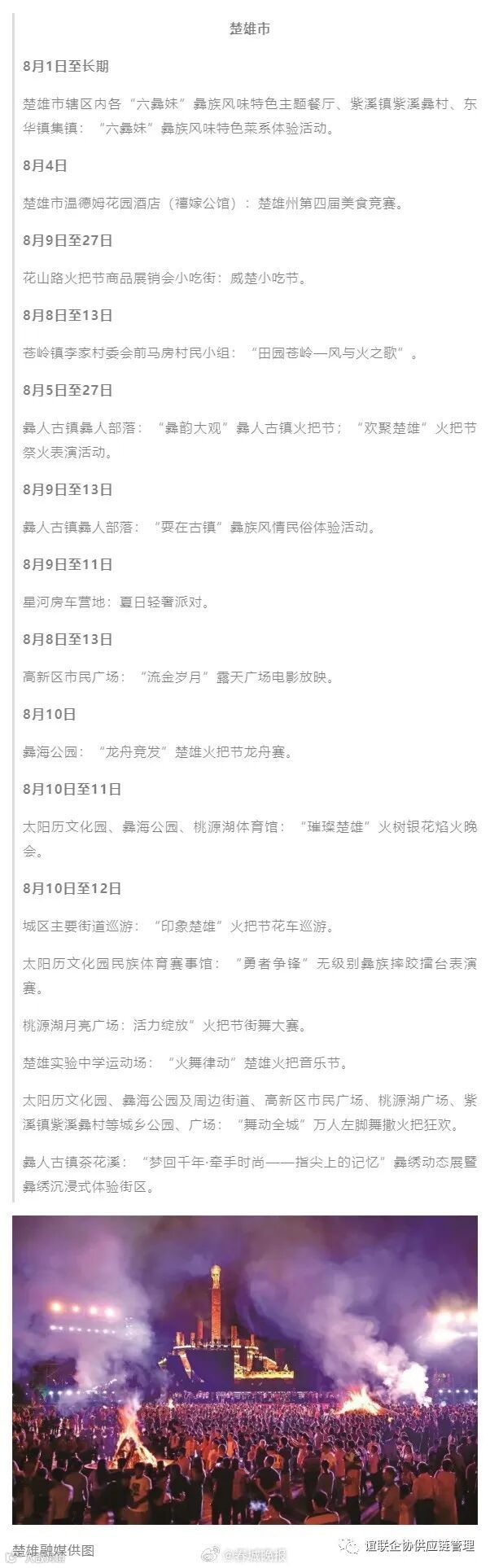 今年楚雄彝族自治州火把节亮点纷呈、精彩非凡。有“舞动全城”万人左脚舞撒火把狂欢、“彝味飘香”彝族火把美食节和特色产品展销、广场舞大赛、文艺演出、火把节龙舟赛等丰富多彩的活动。除了楚雄市以外,各县分会场也会共同欢庆,把火把节的气氛和热闹带给大家。