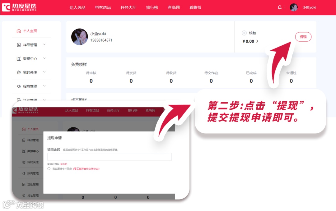 进入热度星选官网:www.reduxingxuan.com,点击右上方“登录”—进入“个人中心”—点击“提现”按钮,提交提现申请即可。