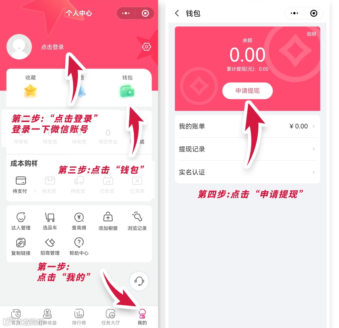 进入热度星选小程序,点击“我的”——“点击登录”——点击“钱包”——点击“申请提现”即可
