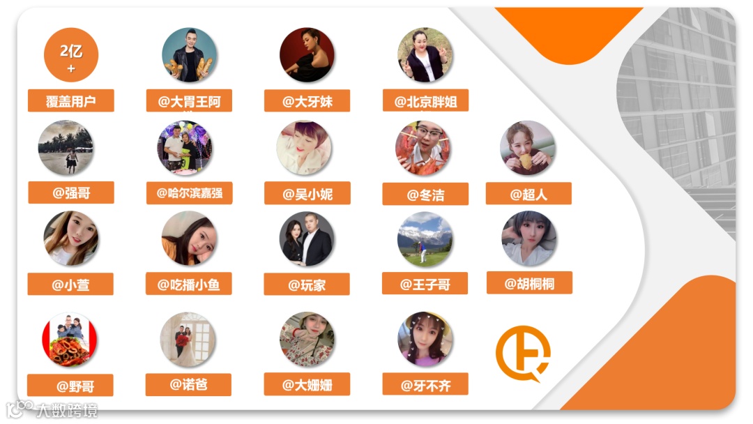累计服务100余位100W+粉丝的头部、500余位腰部达人,触达视频直播达人数千人,覆盖线上用户高达2亿+。