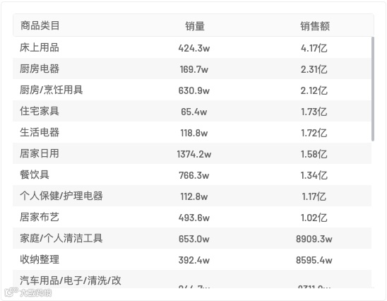 家居用品类目GMV对比上周数据增长26.2%,子类目GMV货品结构为床上用品(18.56%)、厨房/烹饪用具(9.45%)、厨房电器(10.27%)、住宅家具(7.70%)、生活电器(7.66%)和居家日用(7.03%)等。GMV增量贡献值最高的子类目为床上用品,细分类目被子、枕头类目增量明显,与五一期间快速升温的季节因素有较大的关系。生活电器类目中,上周的风扇、空气循环扇销量激增,本周销量较为低迷,而扫地机器人、洗地机产品下滑量较小,除螨仪产品本周预估GMV环比上周数据,只剩下50%的产出体量。