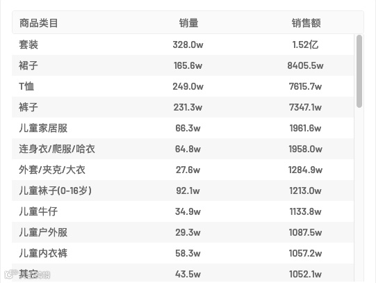 6、T恤汗衫等换季服饰有小幅度上涨,盘面比较稳定,儿童T恤连续两周数据下滑;